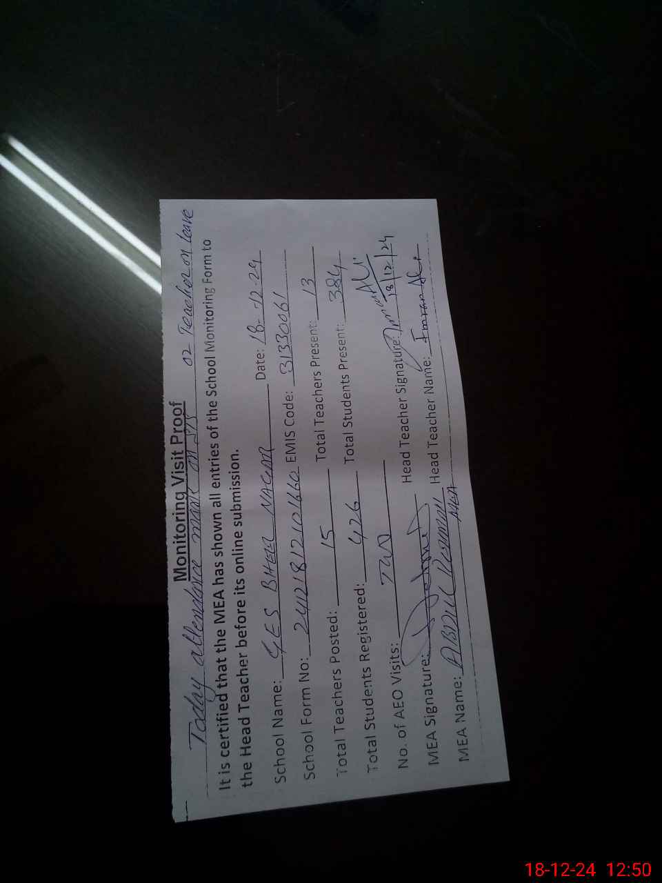 | Attendance Register | Head Teacher | MEA with School | Visit Proof |