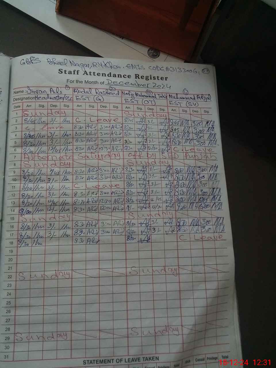 | CNIC | Full Name | Designation | R/C | Absence During Last Calender Month |