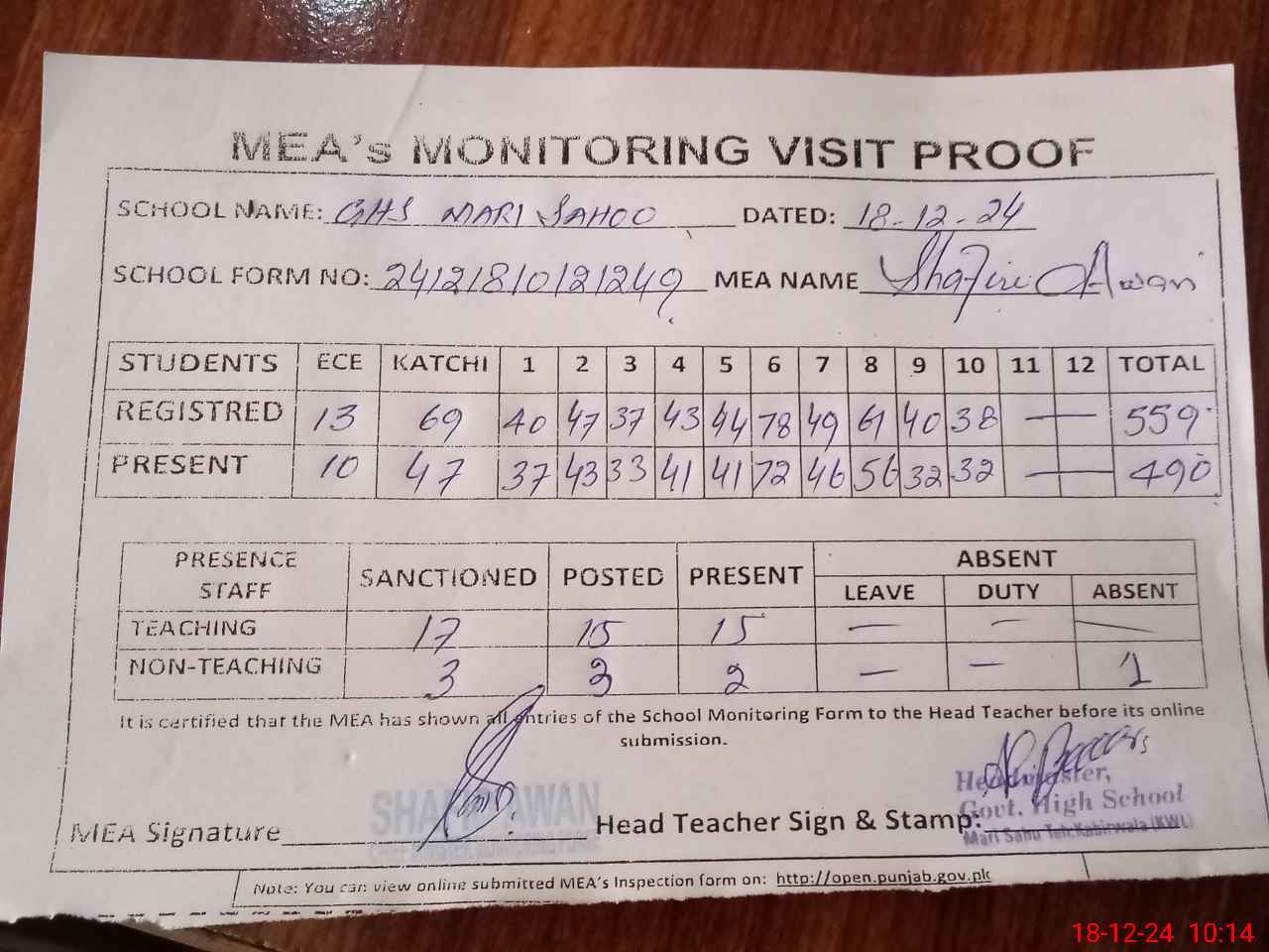 | EMIS Code: 36410049 | Name of School: GHS MARI SAHU, KABIRWALA | |||