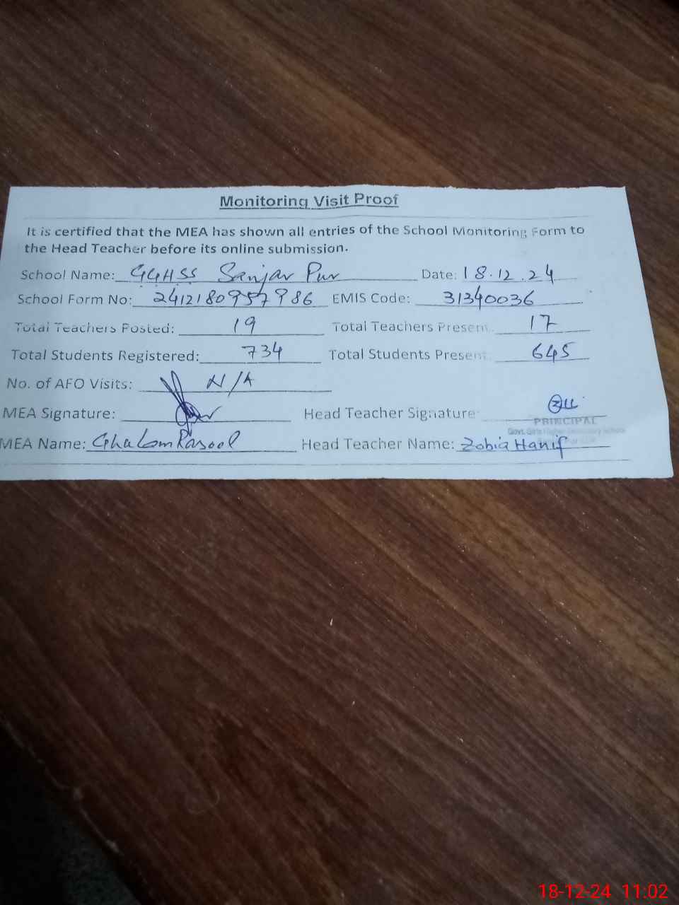 | EMIS Code: 31340036 | Name of School: GGHSS SANJAR PUR | |||