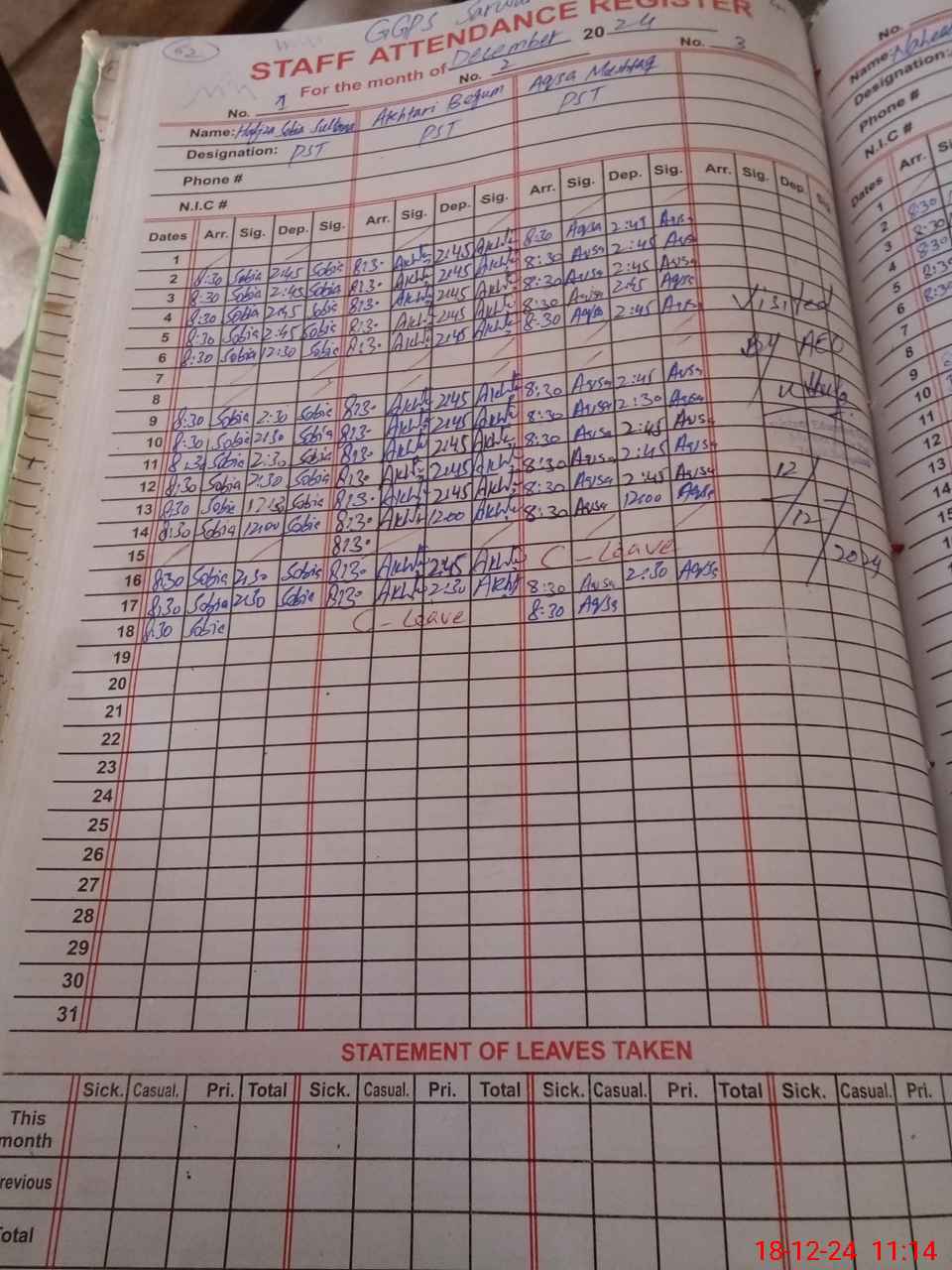 | CNIC | Full Name | Designation | R/C | Absence During Last Calender Month |