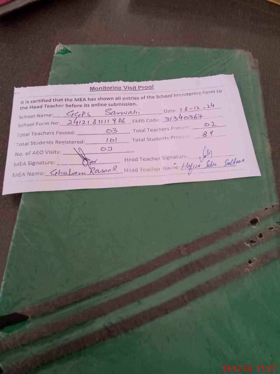| Attendance Register | Head Teacher | MEA with School | Visit Proof |