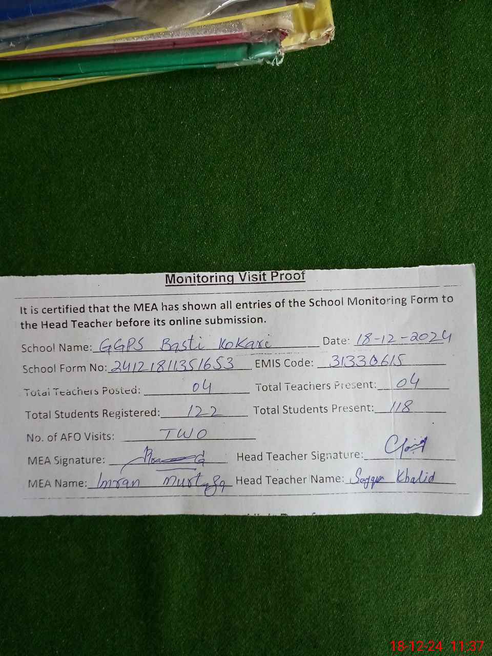| EMIS Code: 31330615 | Name of School: GGPS BAST KOKARI | |||