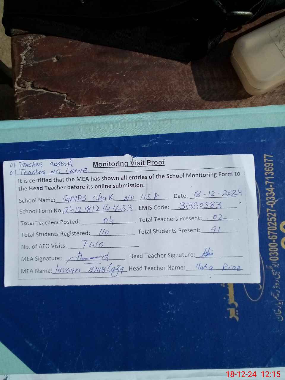 | EMIS Code: 31330583 | Name of School: GMPS CHAK NO.115/P | |||
