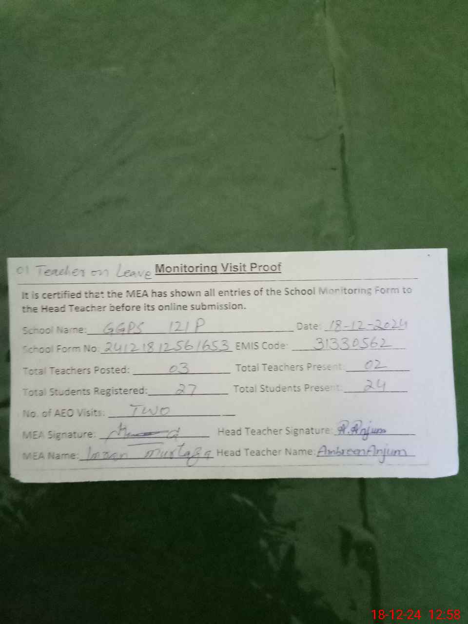 | Attendance Register | Head Teacher | MEA with School | Visit Proof |