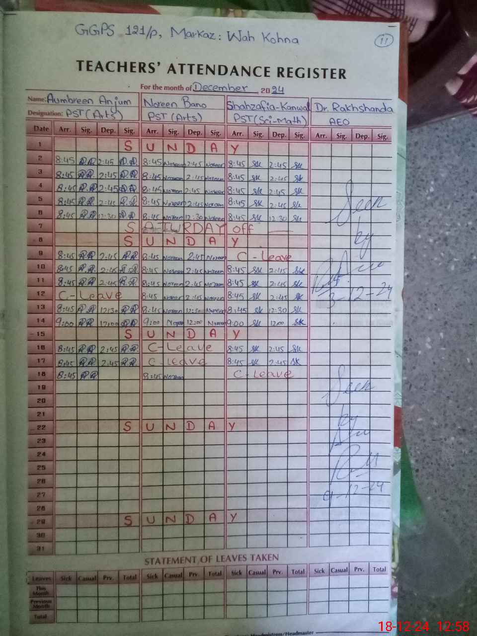 | CNIC | Full Name | Designation | R/C | Absence During Last Calender Month |