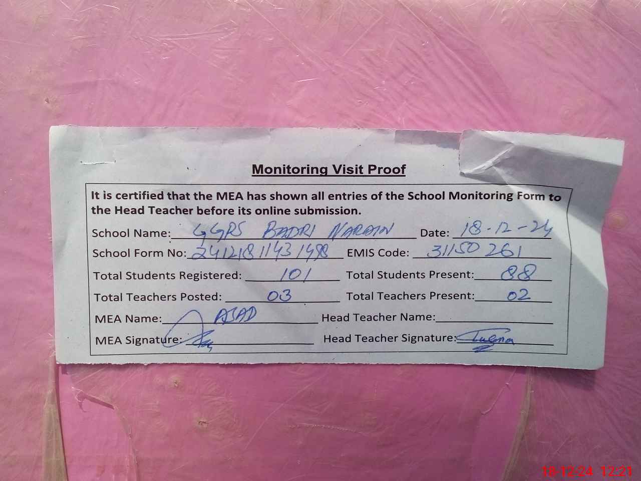 | EMIS Code: 31150261 | Name of School: GGPS BADRI NARAIN PURA | |||