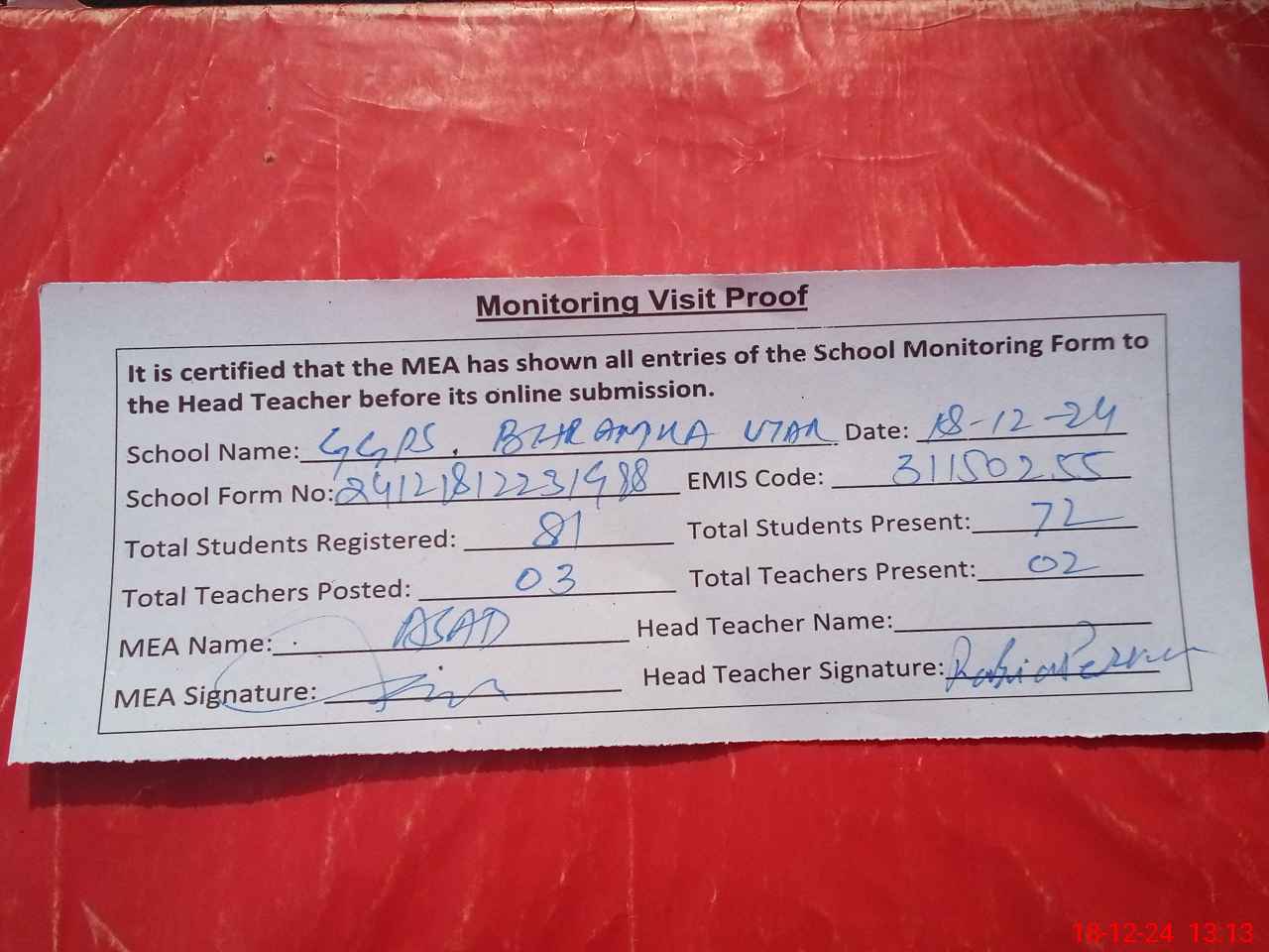 | Attendance Register | Head Teacher | MEA with School | Visit Proof |