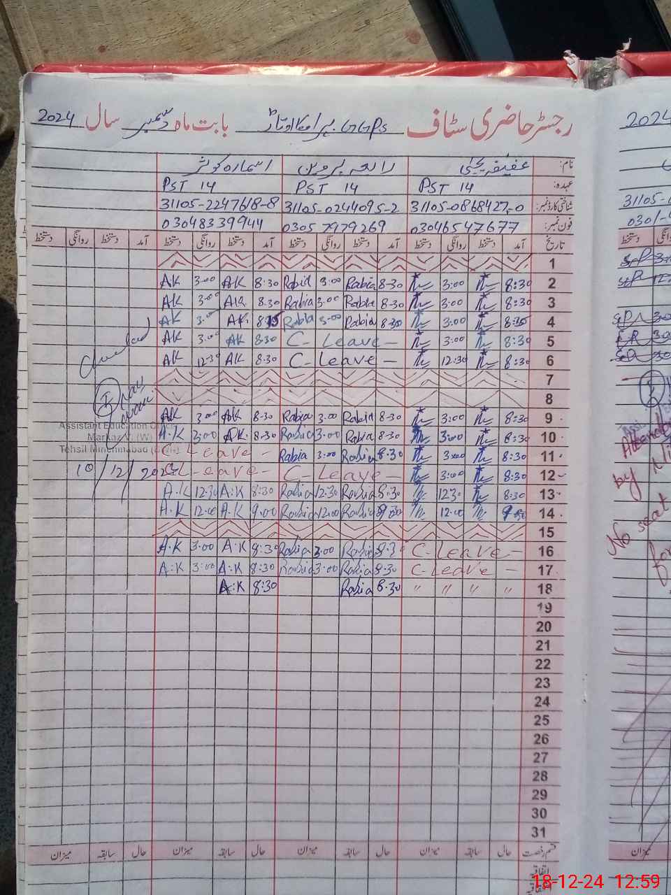 | CNIC | Full Name | Designation | R/C | Absence during last cal. month |