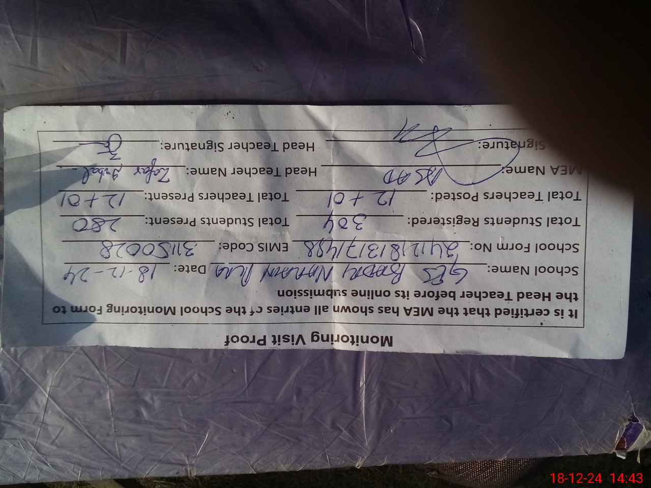| Attendance Register | Head Teacher | MEA with School | Visit Proof |