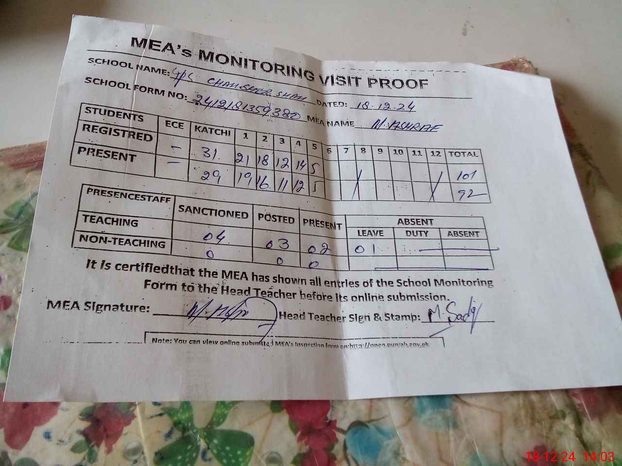 | Attendance Register | Head Teacher | MEA with School | Visit Proof |