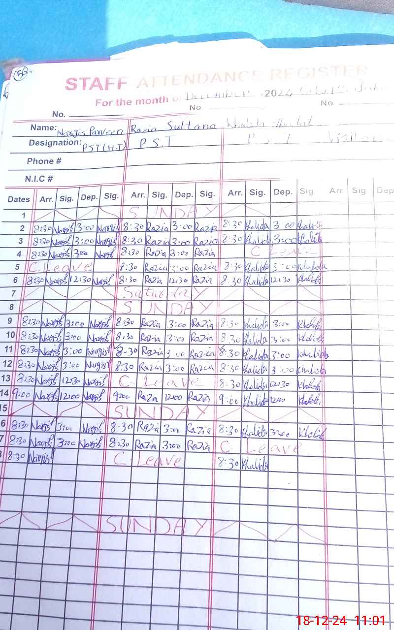 | CNIC | Full Name | Designation | R/C | Absence During Last Calender Month |