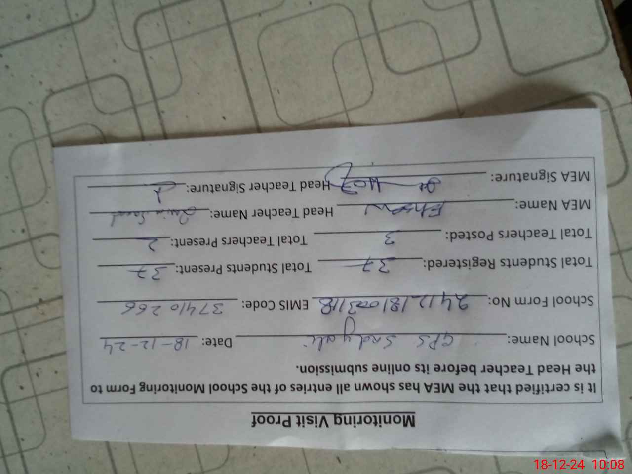 | Attendance Register | Head Teacher | MEA with School | Visit Proof |