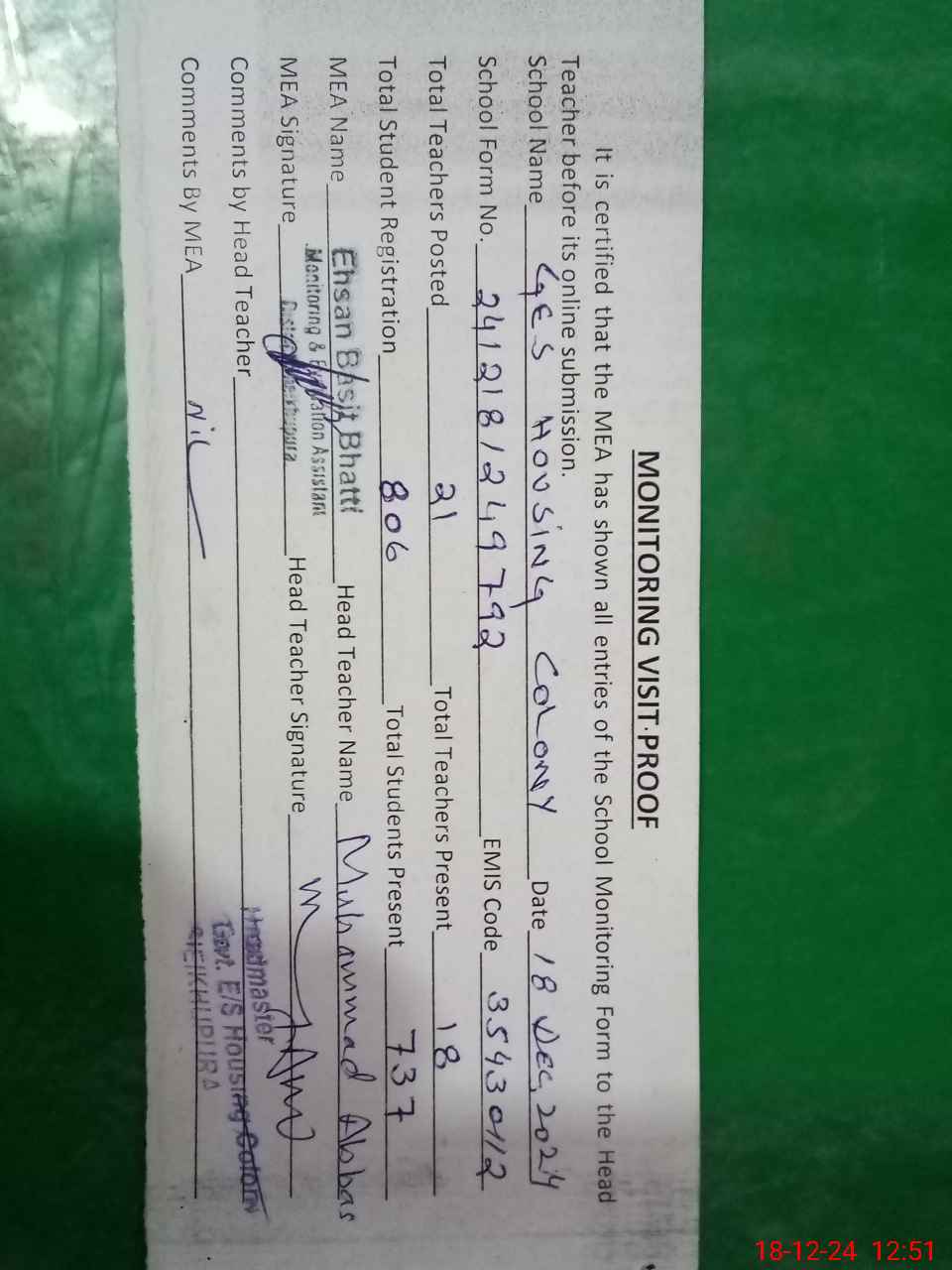 | Certified that this School was Inspected by the Undersigned MEA/DMO Today and the Information Stated Above is as Per Record. | |||||