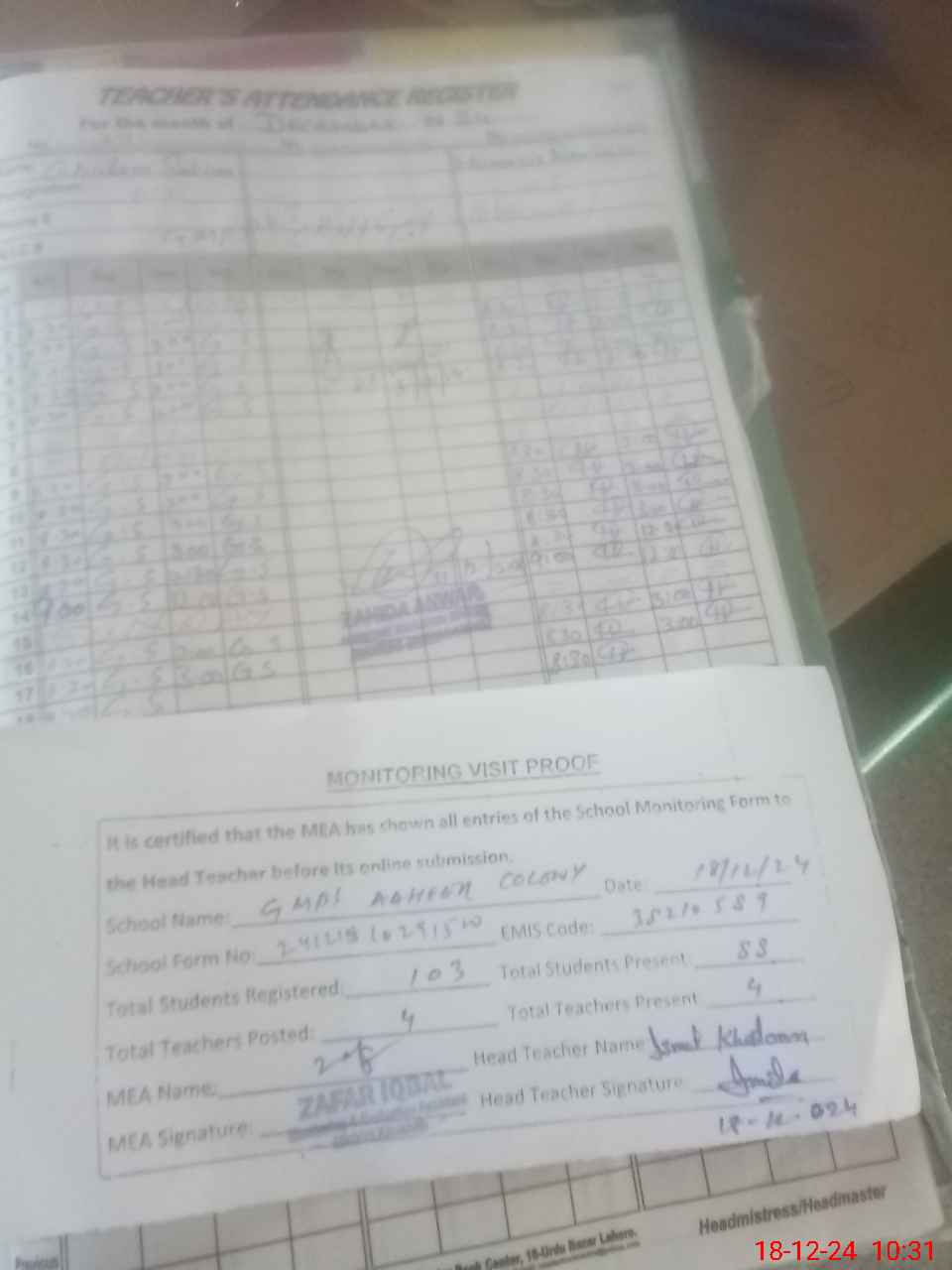 | Attendance Register | Head Teacher | MEA with School | Visit Proof |