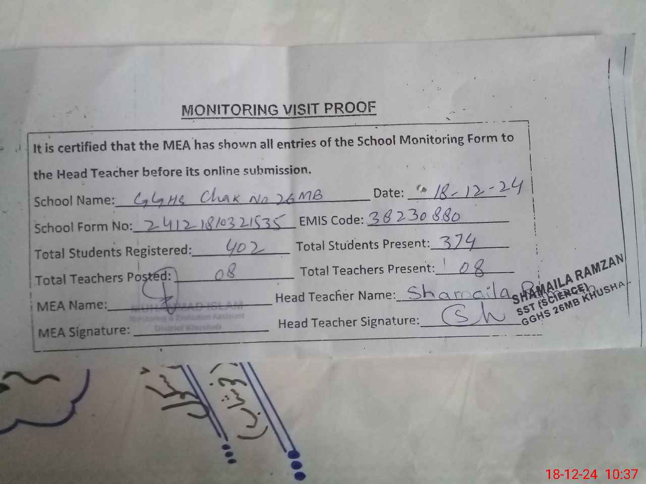 | EMIS Code: 38230880 | Name of School: GGHS CHAK NO 26 MB | |||