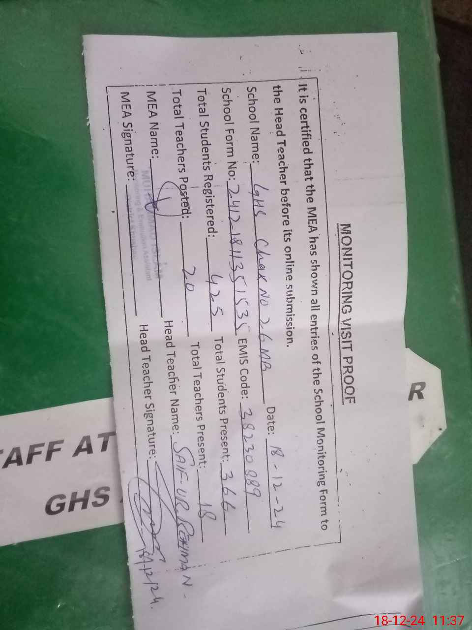 | Attendance Register | Head Teacher | MEA with School | Visit Proof |