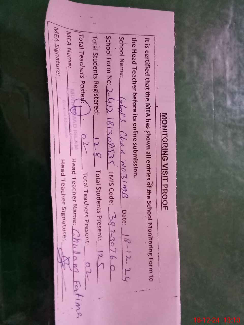 | Attendance Register | Head Teacher | MEA with School | Visit Proof |