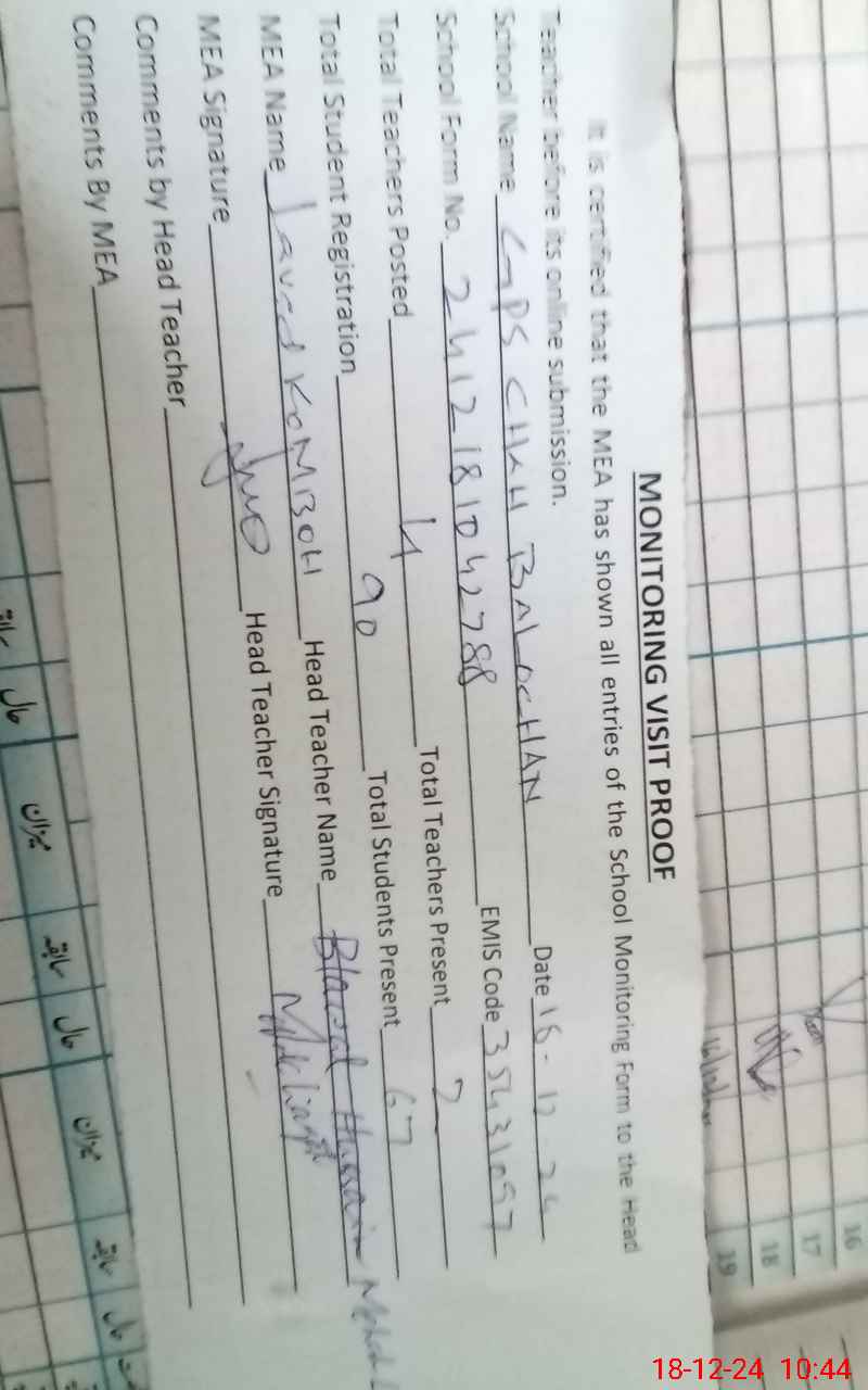 | EMIS Code: 35431097 | Name of School: GPS CHAH BALOCHAN | |||