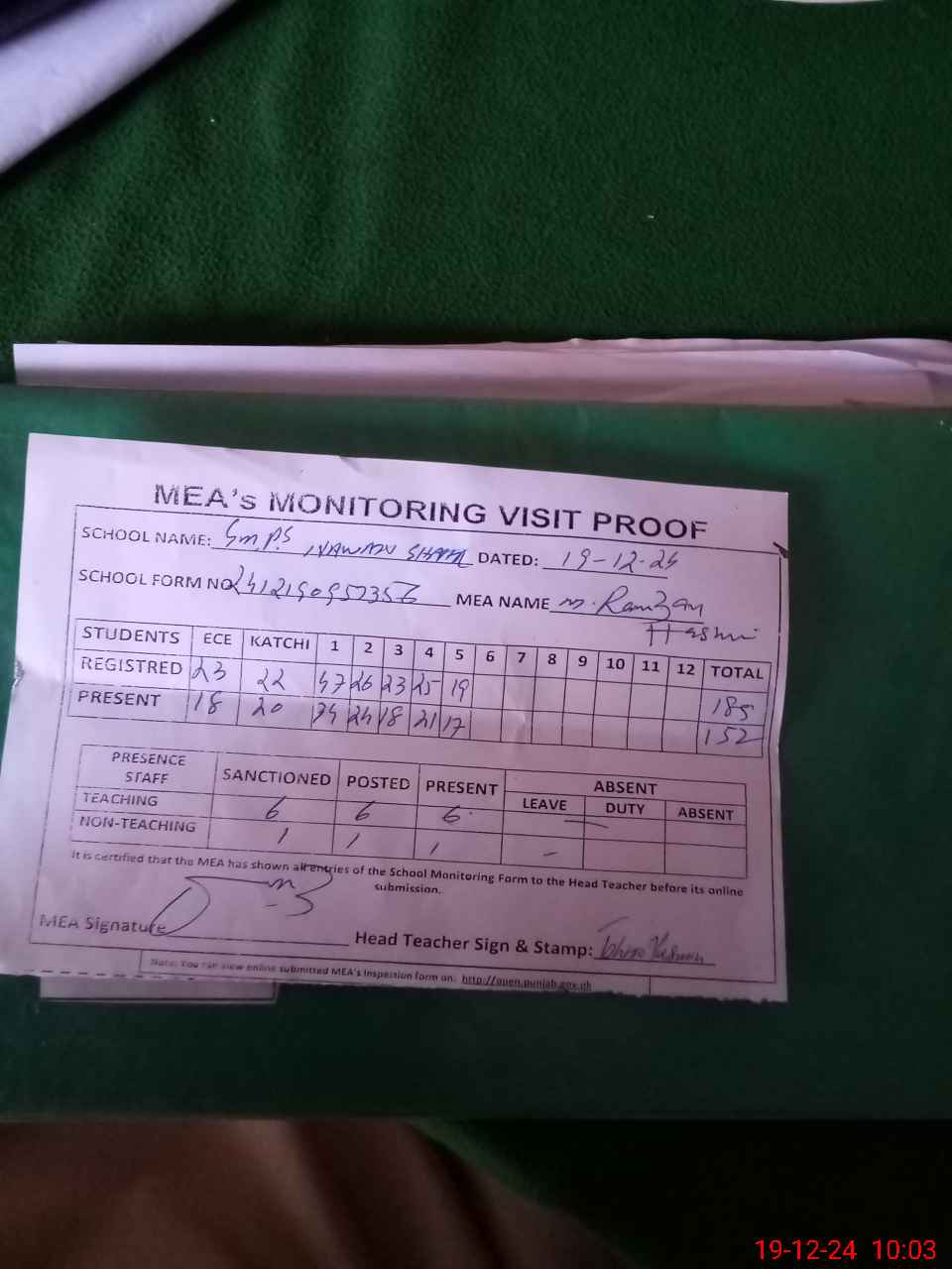 | Attendance Register | Head Teacher | MEA with School | Visit Proof |