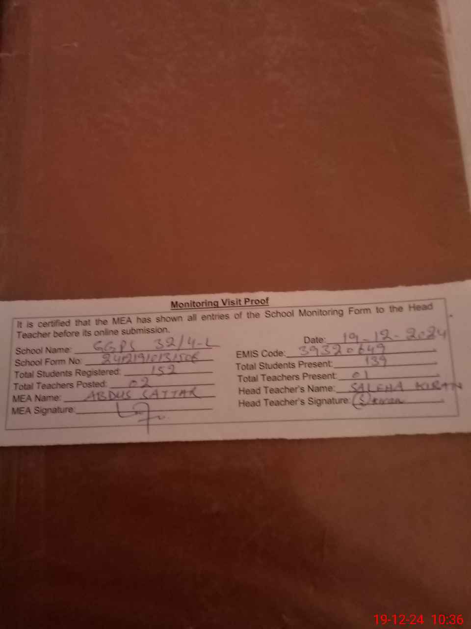 | Attendance Register | Head Teacher | MEA with School | Visit Proof |