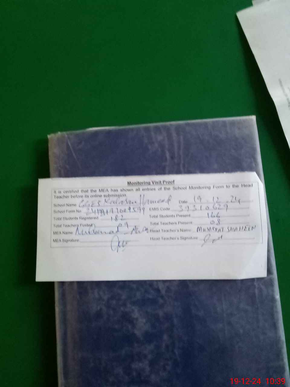| Attendance Register | Head Teacher | MEA with School | Visit Proof |