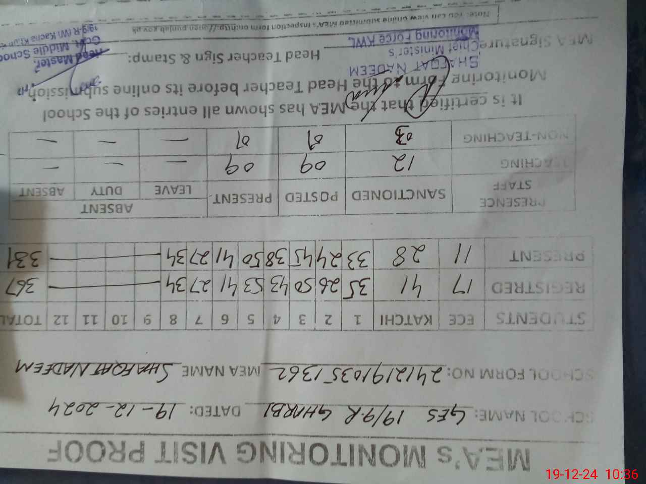 | Attendance Register | Head Teacher | MEA with School | Visit Proof |