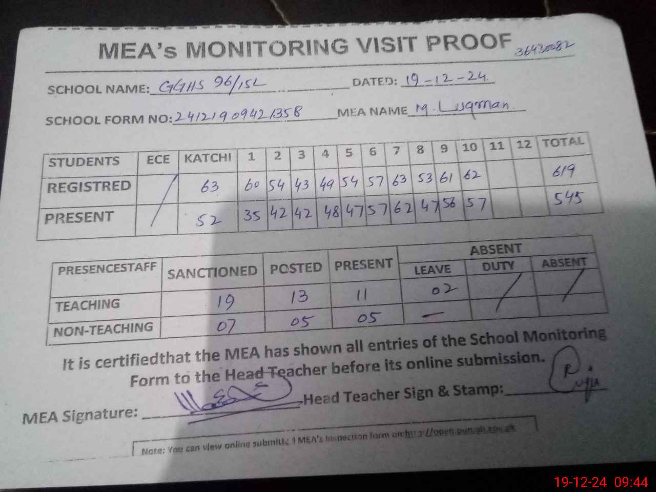 | EMIS Code: 36430082 | Name of School: GGHS 96/15-L, MIAN CHANNU | |||