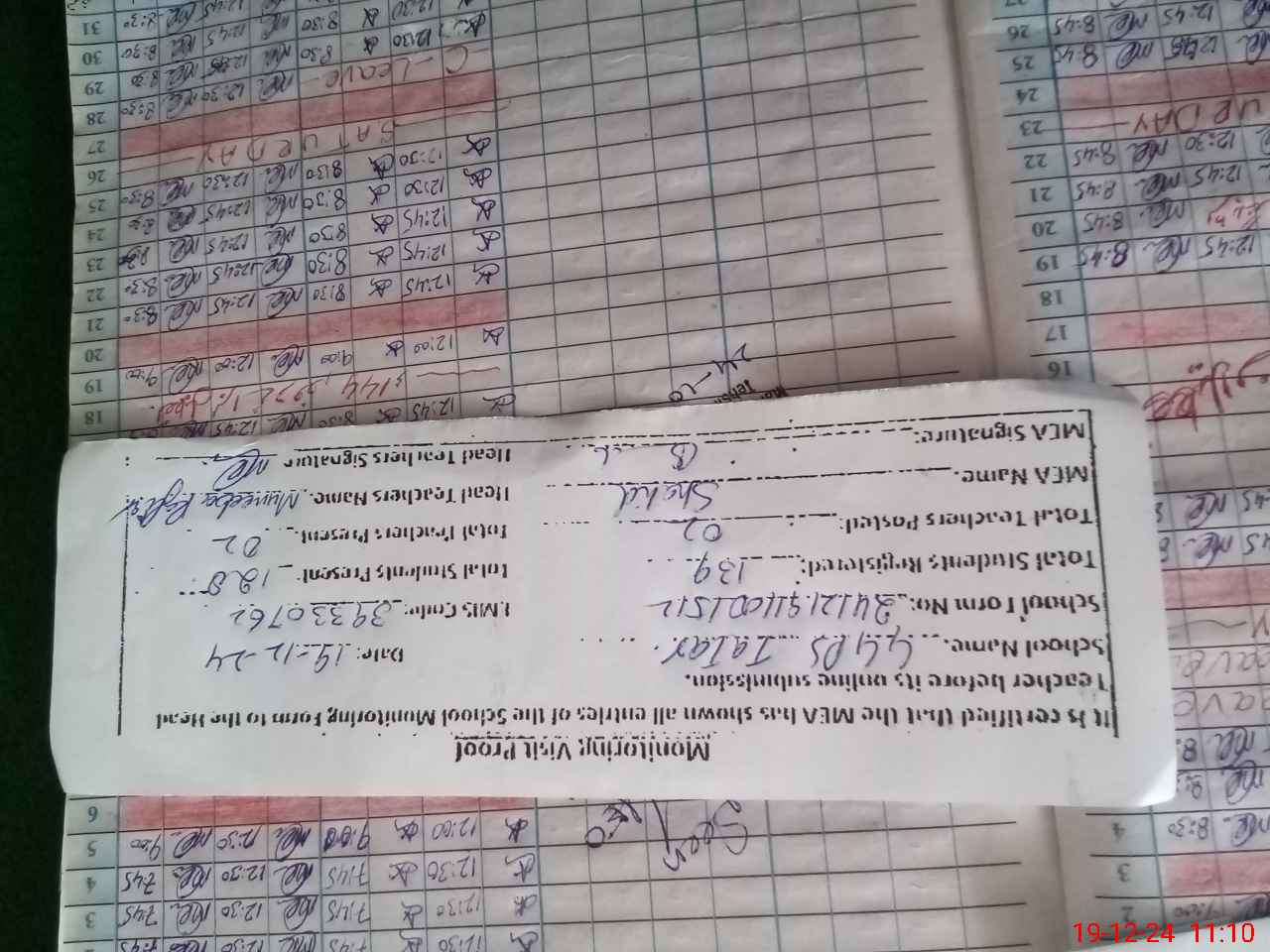 | Attendance Register | Head Teacher | MEA with School | Visit Proof |