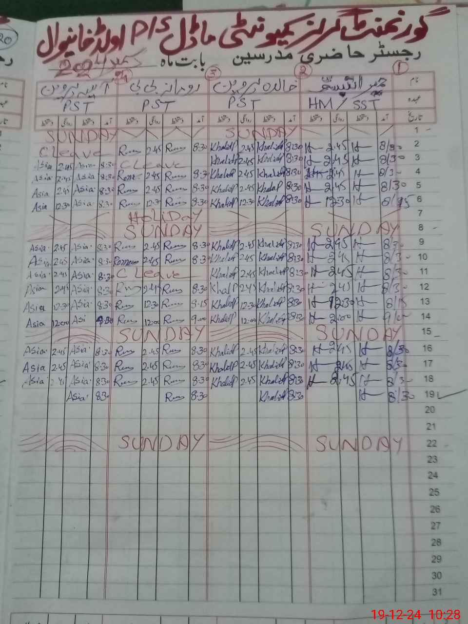 | CNIC | Full Name | Designation | R/C | Absence During Last Calender Month |
