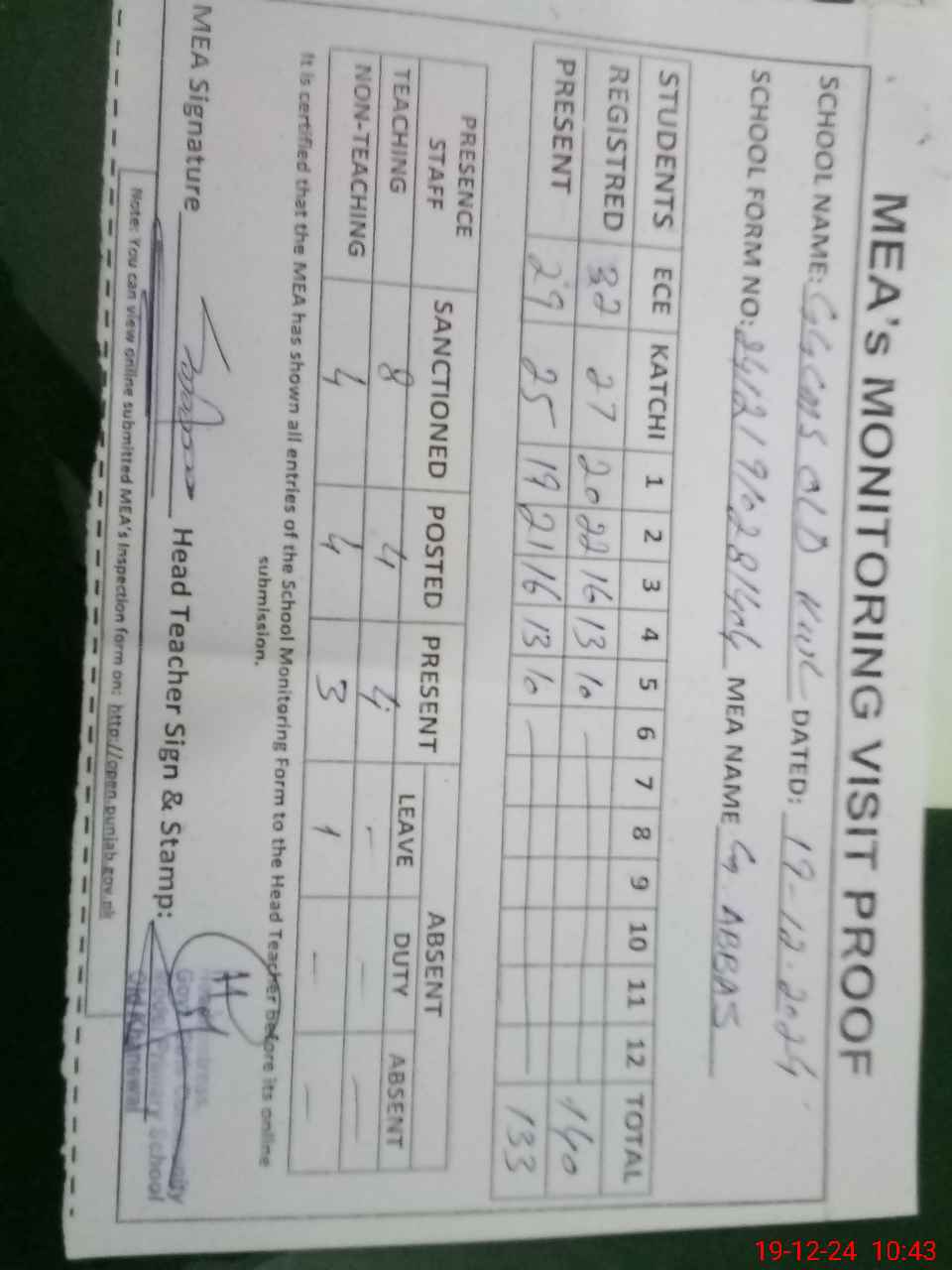 | Attendance Register | Head Teacher | MEA with School | Visit Proof |