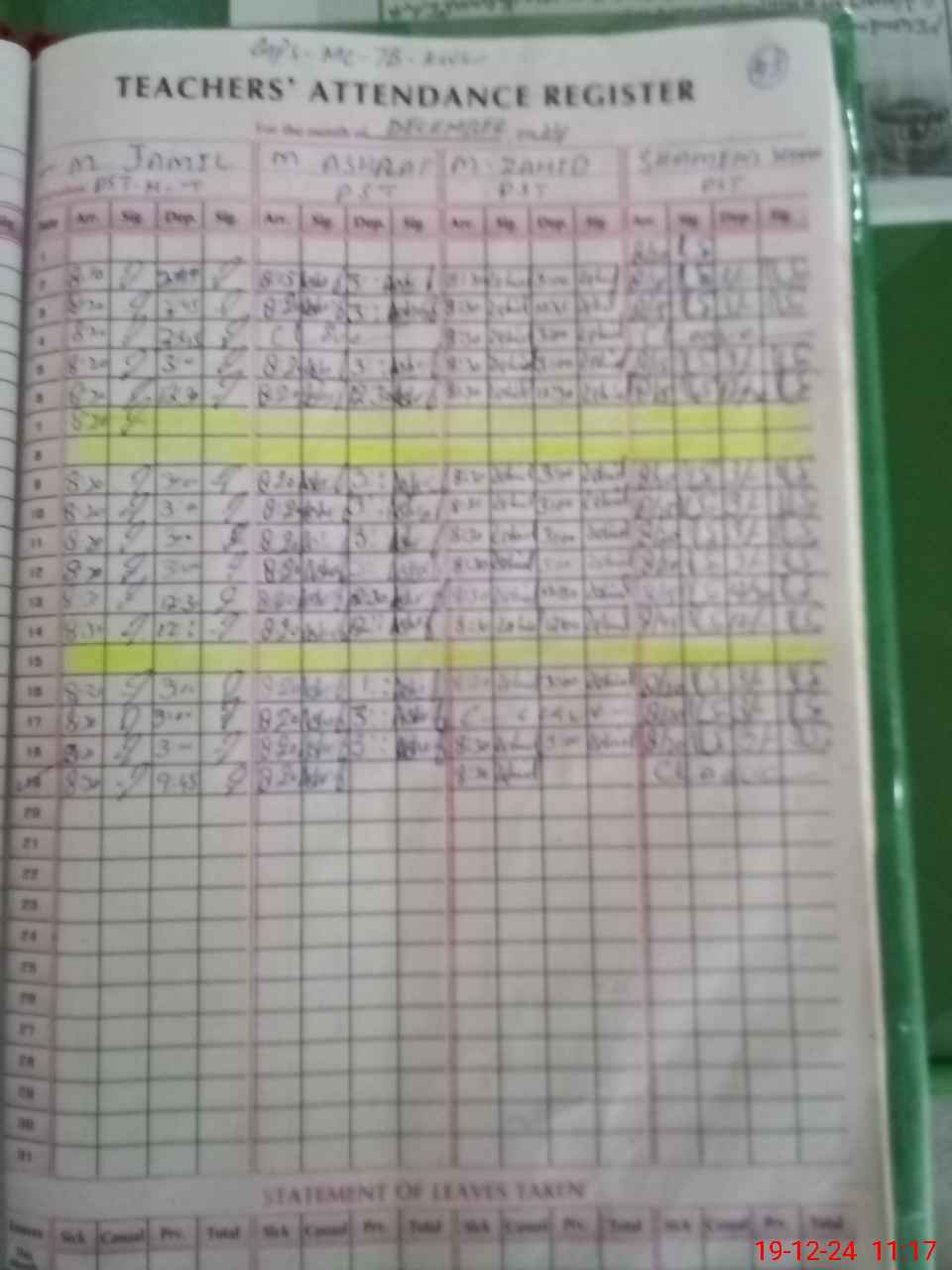 | Remarks (Use Separate Page if Required): 02 teachers are on leave with manual applications sis is not working for leave aproval During random attendance of 15 students listed students are promoted and left the school | |||||