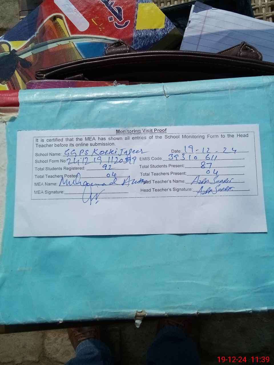 | Attendance Register | Head Teacher | MEA with School | Visit Proof |