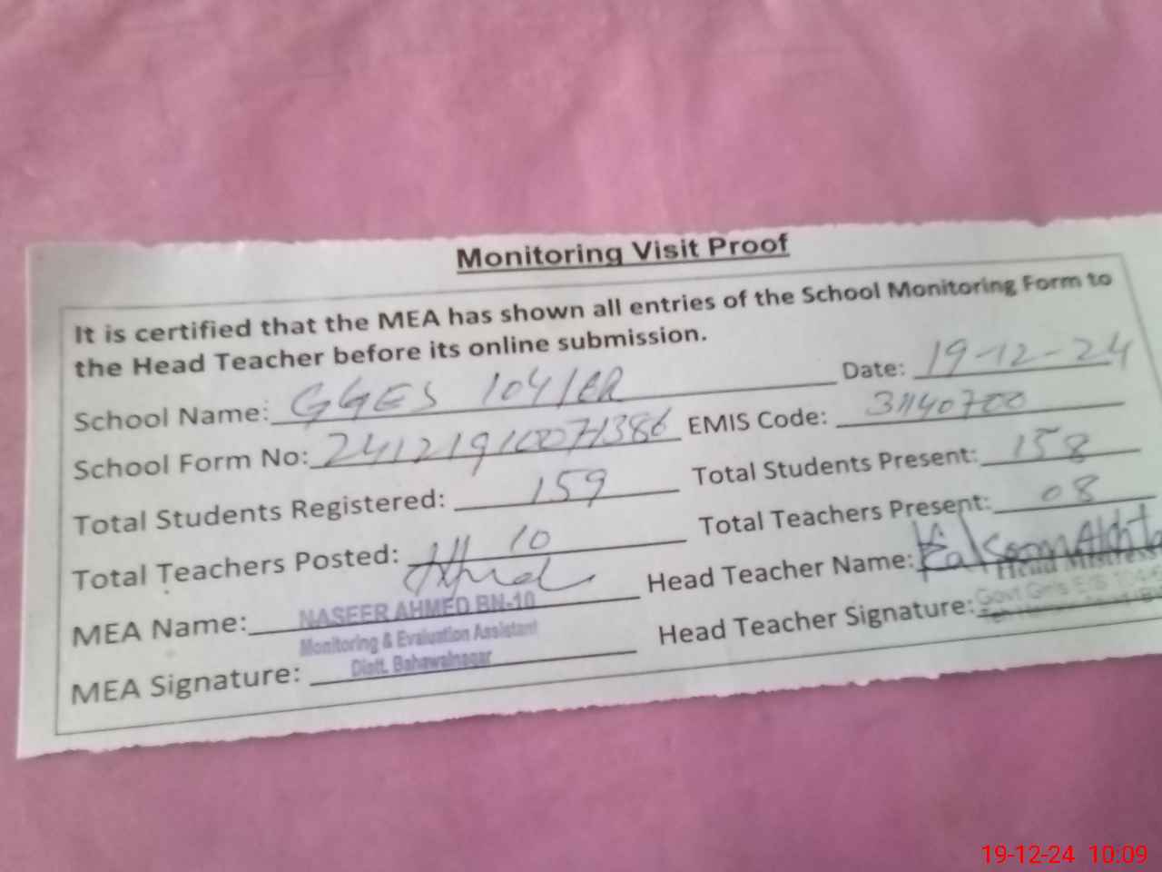 | EMIS Code: 31140700 | Name of School: GGES CHAK NO 104/6-R | |||