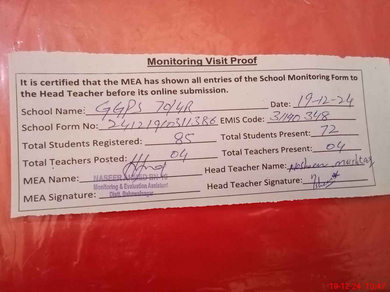 | EMIS Code: 31140348 | Name of School: GGPS CHAK NO 70/4-R | |||