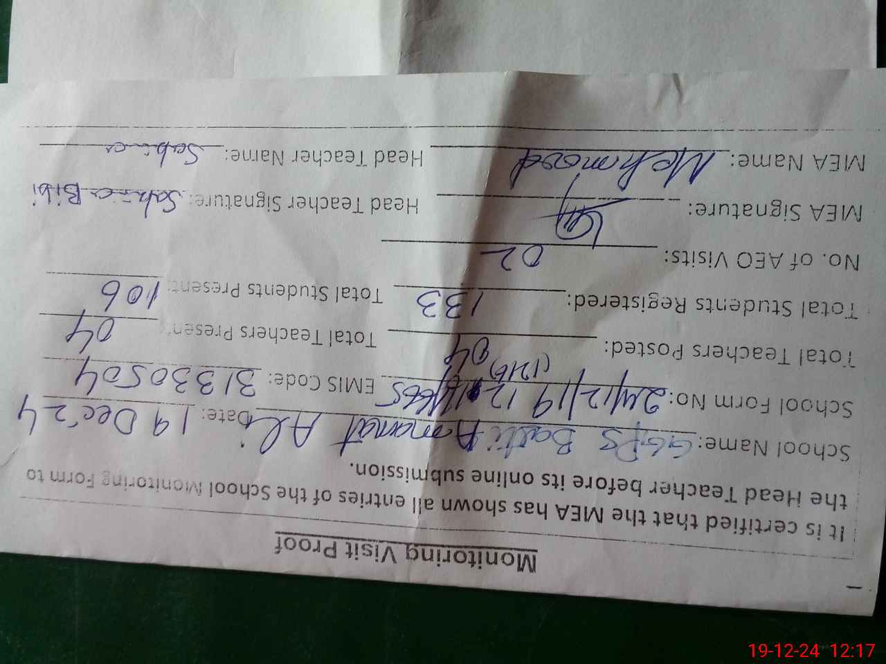 | Certified that this School was Inspected by the Undersigned MEA/DMO Today and the Information Stated Above is as Per Record. | |||||