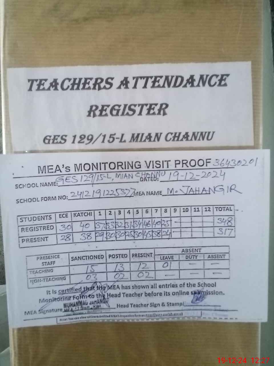 | Attendance Register | Head Teacher | MEA with School | Visit Proof |