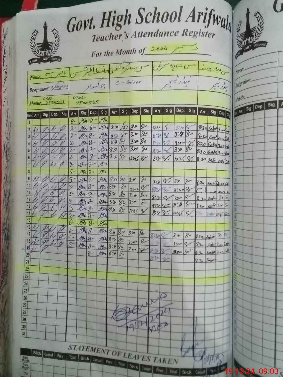 | CNIC | Full Name | Designation | R/C | Absence During Last Calender Month |