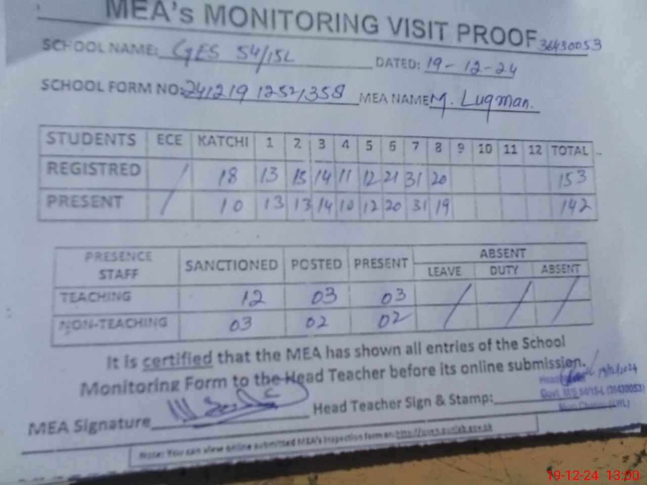 | EMIS Code: 36430053 | Name of School: GES 54/15-L, MIAN CHANNU | |||