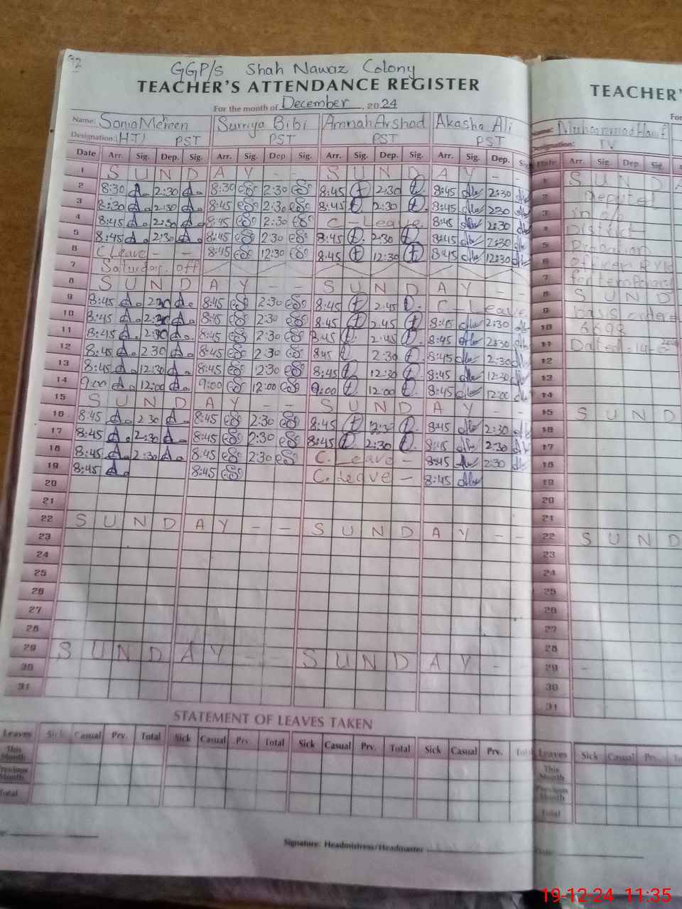 | CNIC | Full Name | Designation | R/C | Absence During Last Calender Month |