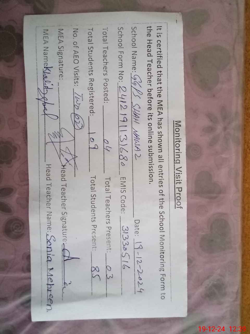 | Certified that this School was Inspected by the Undersigned MEA/DMO Today and the Information Stated Above is as Per Record. | |||||