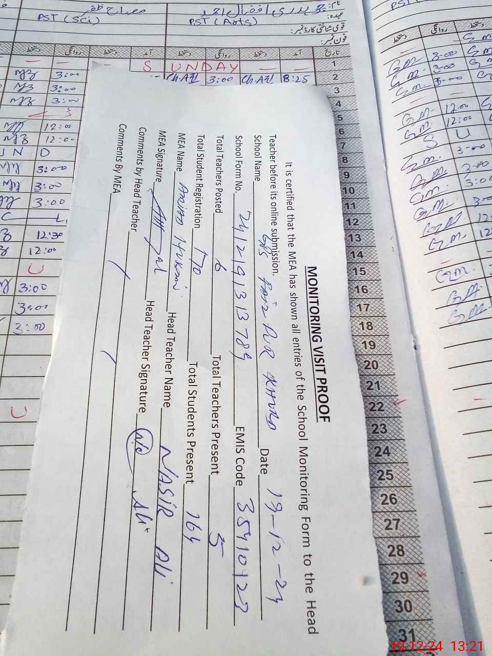 | Attendance Register | Head Teacher | MEA with School | Visit Proof |
