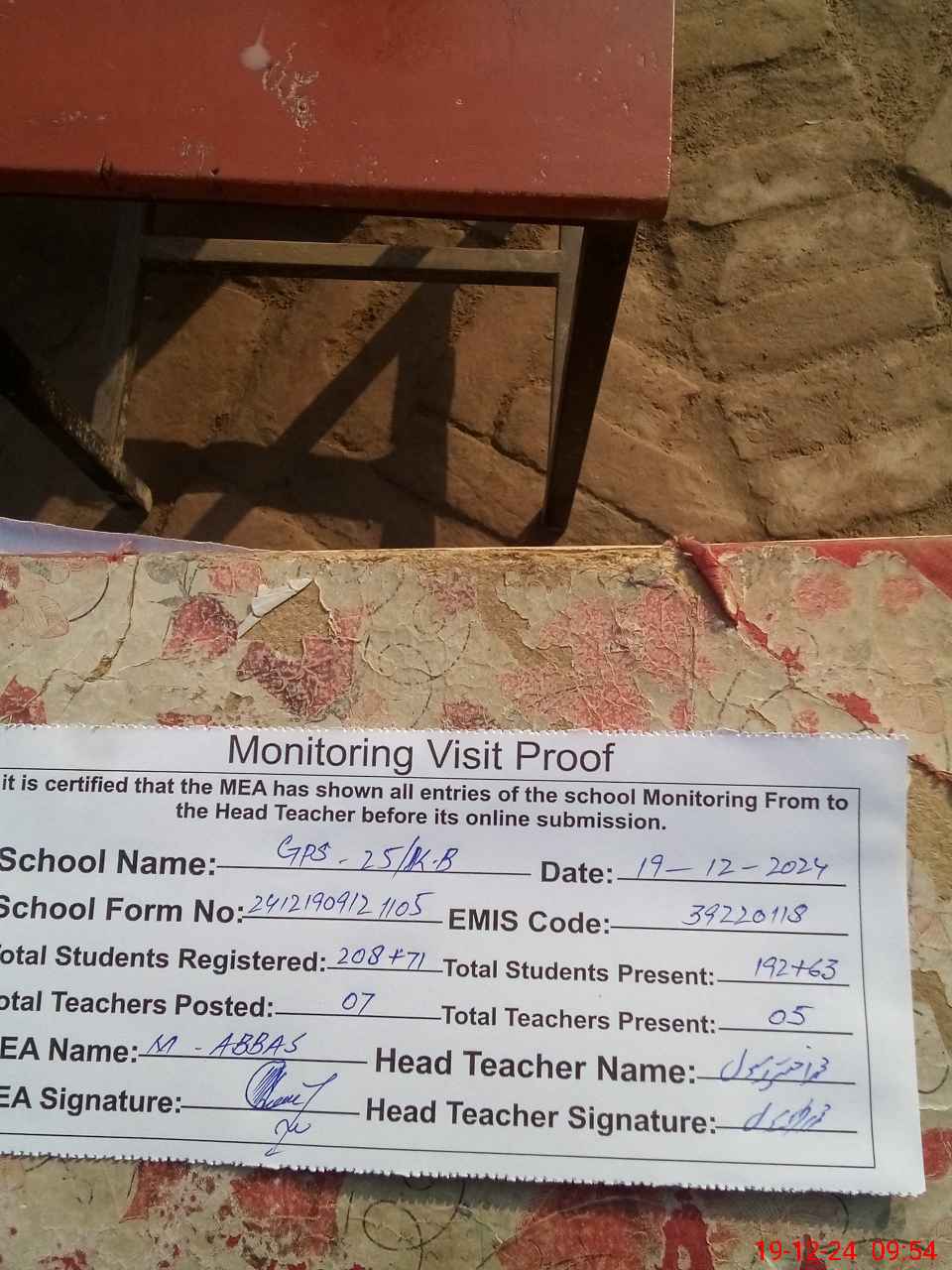 | Attendance Register | Head Teacher | MEA with School | Visit Proof |