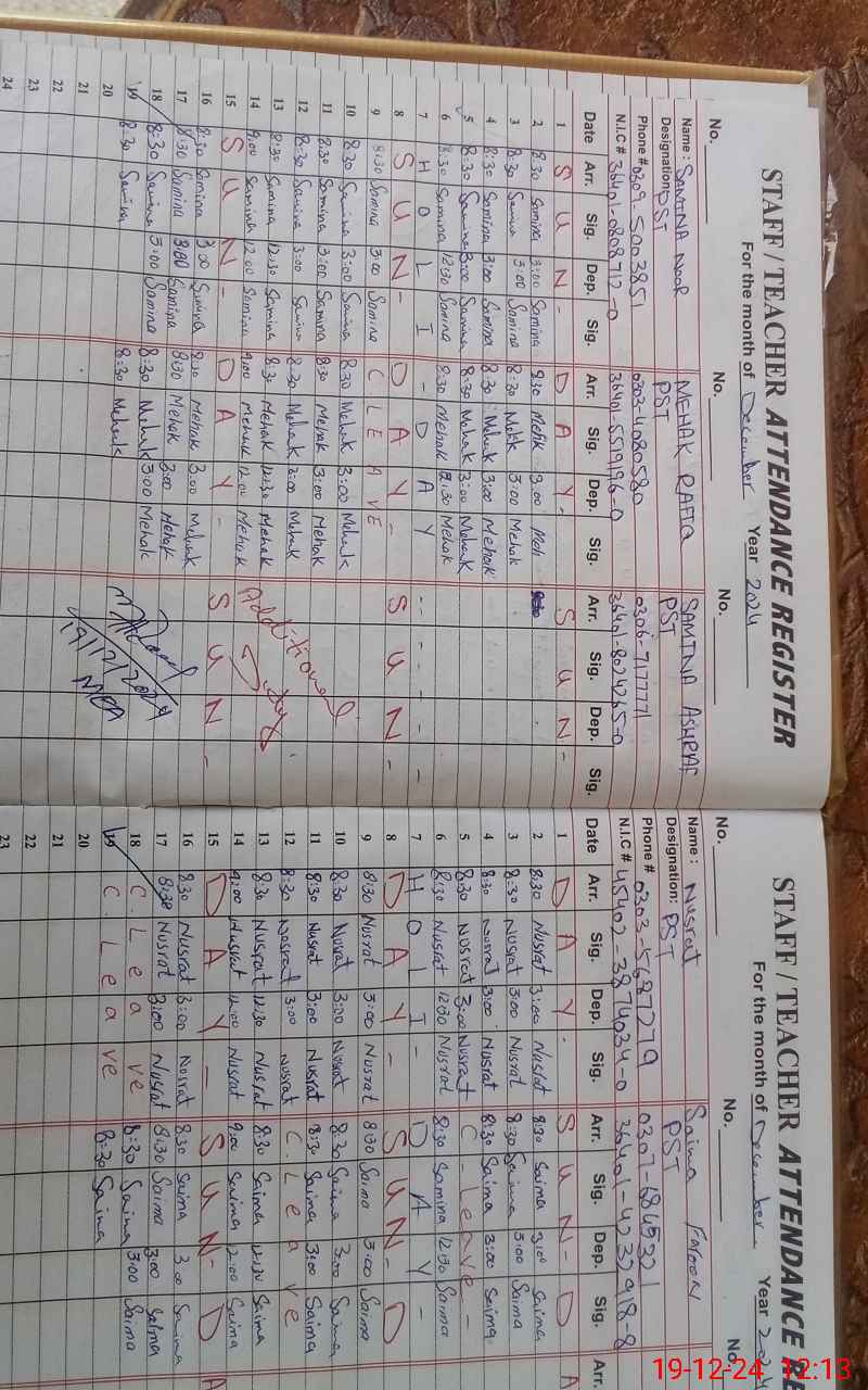 | CNIC | Full Name | Designation | R/C | Absence During Last Calender Month |