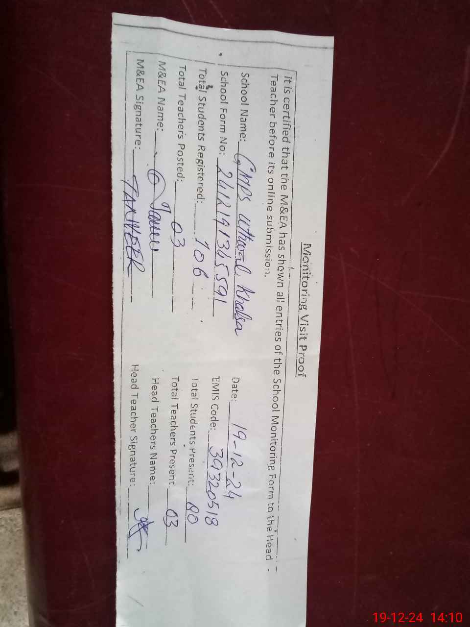 | Attendance Register | Head Teacher | MEA with School | Visit Proof |