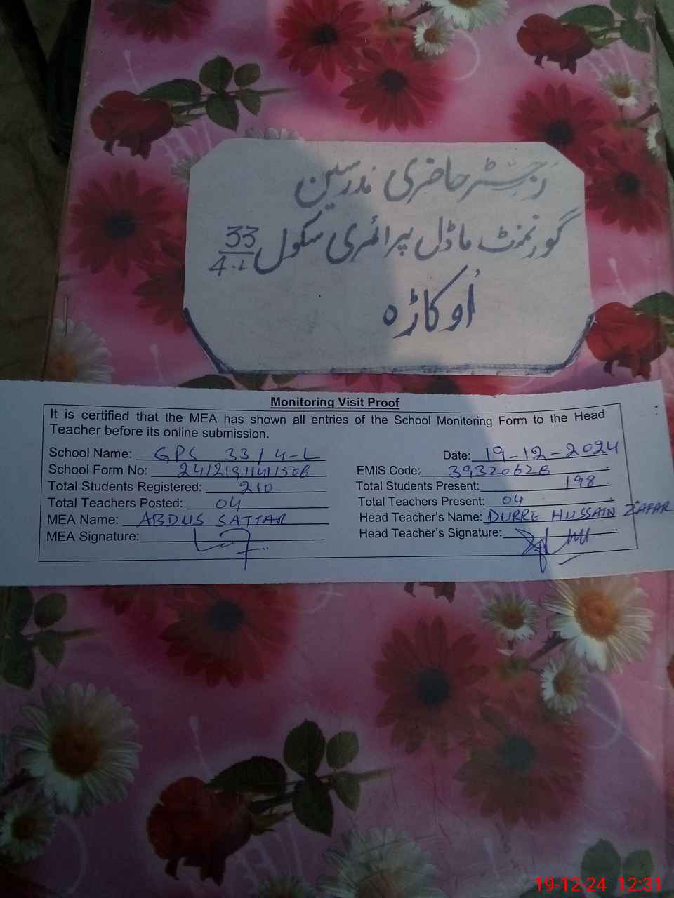 | EMIS Code: 39320628 | Name of School: GMPS CHAK NO. 33/4-L | |||