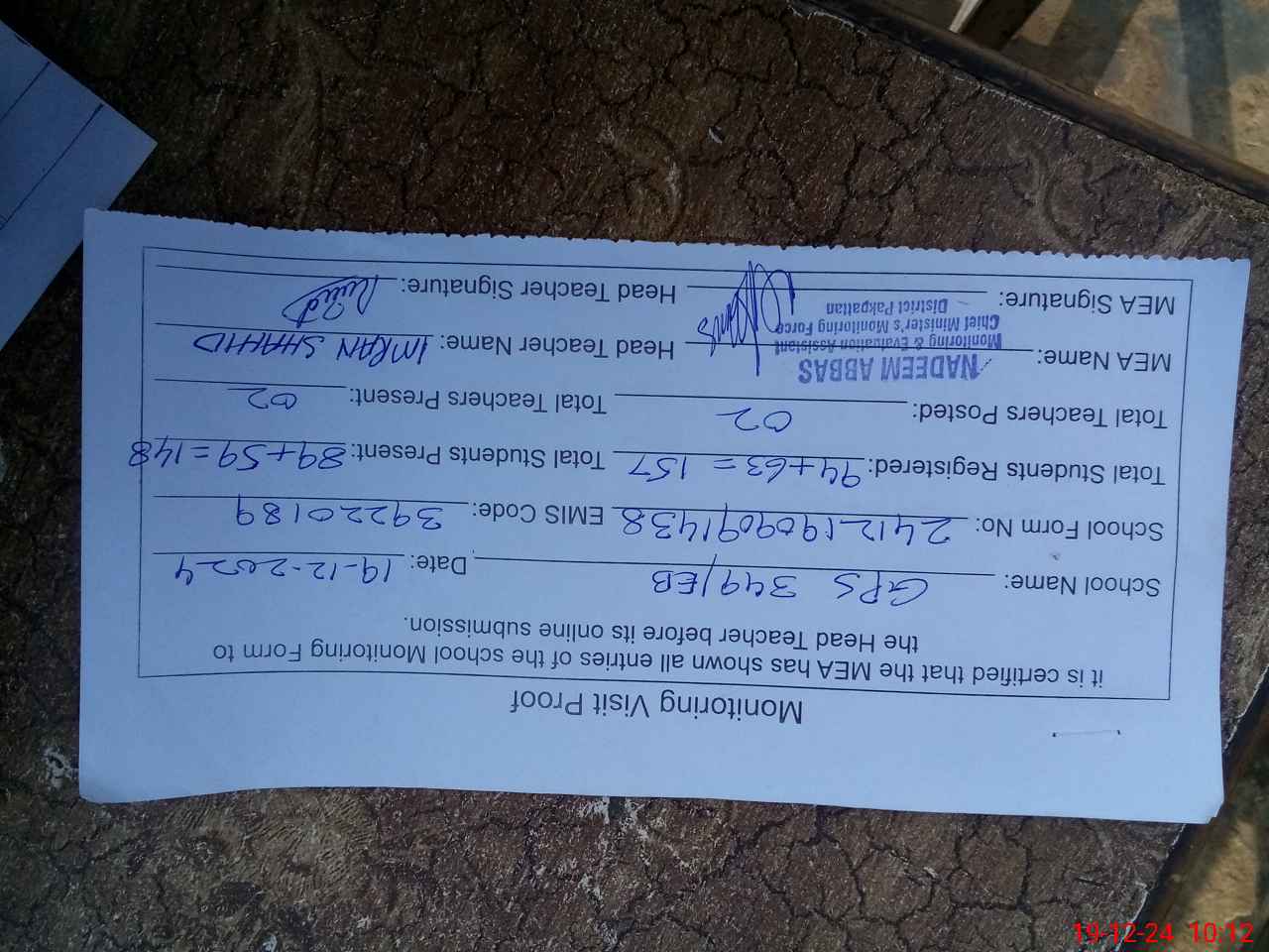 | Certified that this School was Inspected by the Undersigned MEA/DMO Today and the Information Stated Above is as Per Record. | |||||