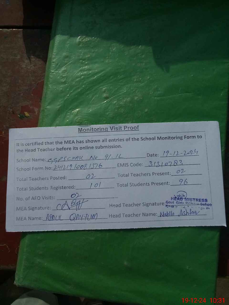 | Attendance Register | Head Teacher | MEA with School | Visit Proof |