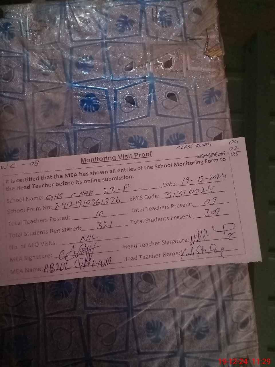 | EMIS Code: 31310025 | Name of School: GHS CHAK NO. 23/P | |||