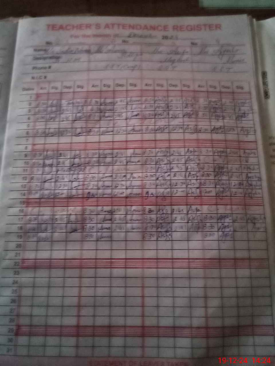 | CNIC | Full Name | Designation | R/C | Absence During Last Calender Month |